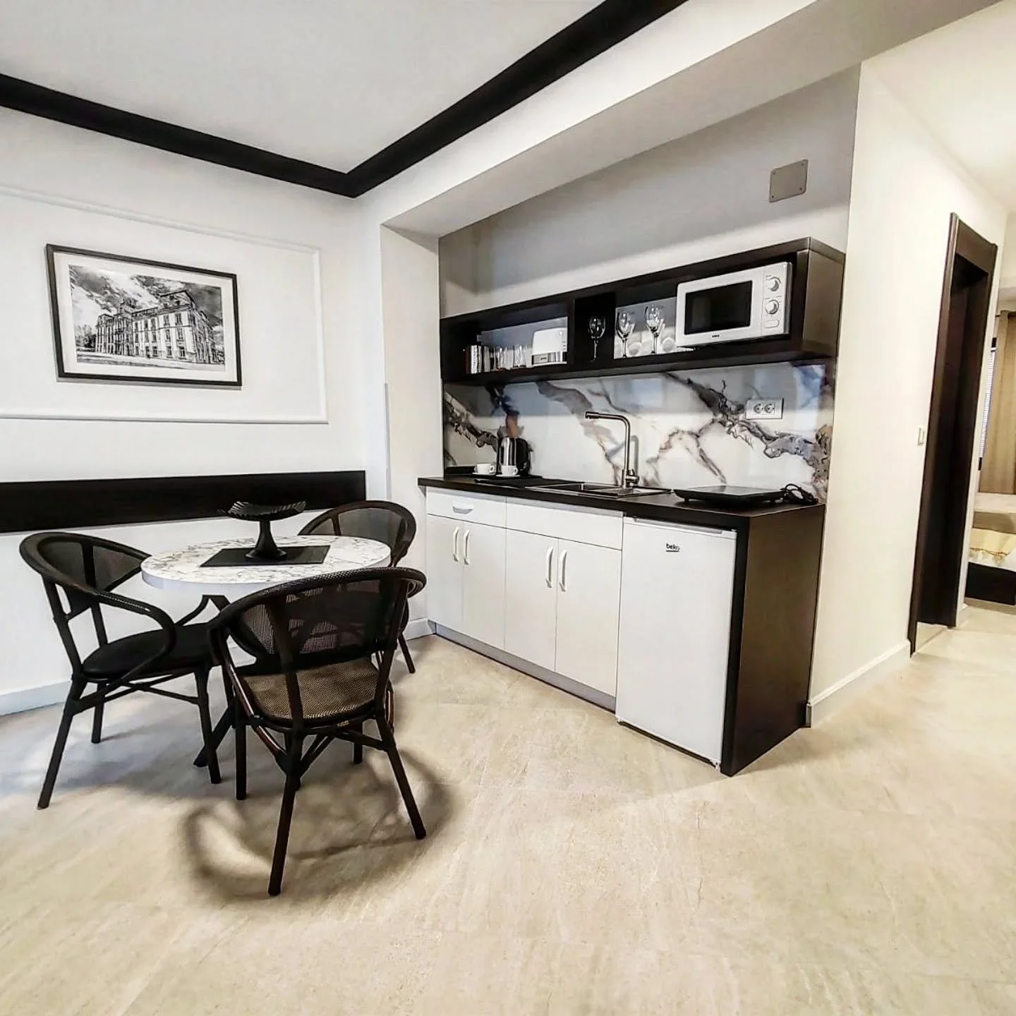 Shared kitchen and dining area with coffee/tea station and appliances for whatever you may need.